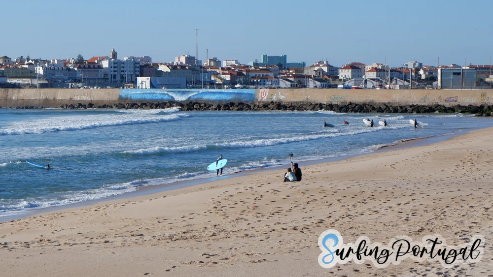 Surf spot of Molhe Leste, with a wave painted on the wall in the background